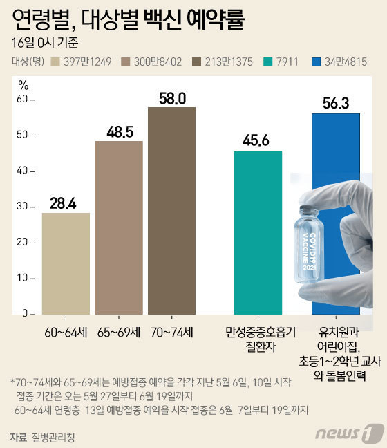 한편 이날 0시 기준 연령별 코로나19 백신 예약접종률은 70~74세 62.2%, 65~69세 55.1%, 60~64세 39.7%를 기록한 것으로 나타났다.
